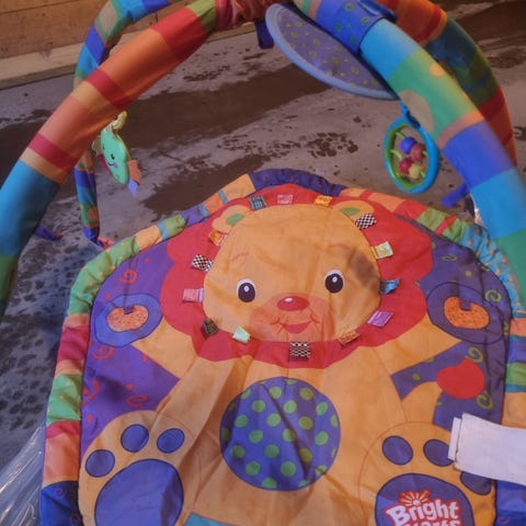 Babygym med myk lekematte og to buer i tekstil. Matten har fargerikt dyremotiv med blant annet løve, sebra og tiger. På buene henger det flere myke leker og rangler som kan tas ned og flyttes. Passer til spedbarn som ligger på rygg eller mage for lek og stimulering av syn, hørsel og motorikk. Flerfarget design i tekstilmateriale.