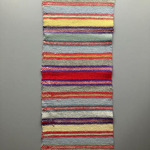 løper - ulløper - veggteppe - håndvevd - håndarbeid - håndlaget - husflid - naturmaterial - vintage - retro - modern - rød - oransje - naturlige materialer - tekstilkunst