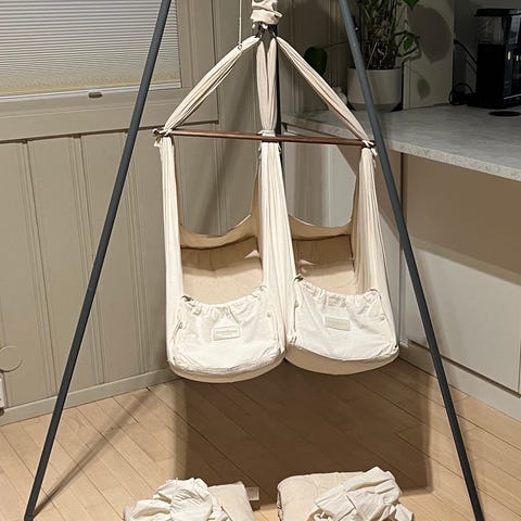 Selger vår Moonboon tvillingvugge som har vært helt fantastisk for oss og våre tvilinger. Vi har brukt ekstra beskyttelseslaken for å beskytte madrassene.