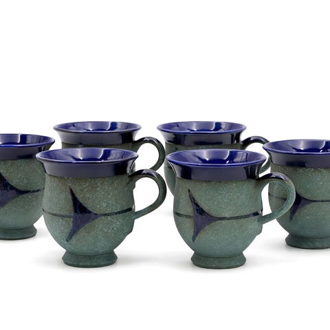 Fatet og skålen bærer keramikerens signatur, formspråket er typisk for nordisk modernisme. Koppene er merket som 2. sortering med doble streker under, noe som kun indikerer mindre kosmetiske variasjoner.