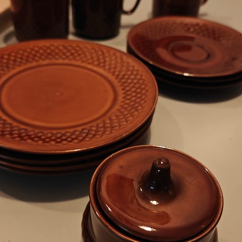Et dekorativt og tidstypisk sett – like fint i bruk som i samling.