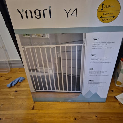 Yngri Y4 er en trykkmontert sikkerhetsgrind beregnet for bruk i døråpninger eller ved trapper. Grindens bredde kan justeres med forlengere (oppgitt på esken), og høyden er tilpasset for å hindre at små barn klatrer over. Utført i metall med vertikale spiler.