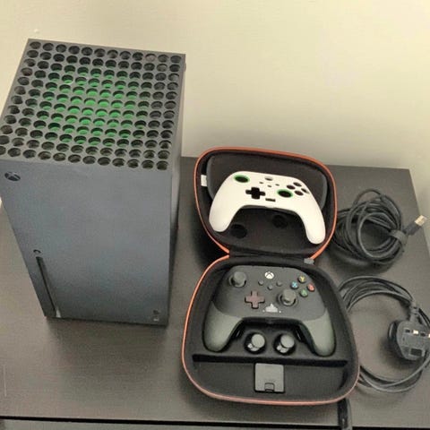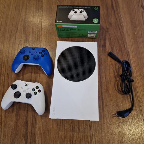 Pent og lite brukt Xbox Series S spillkonsoll i hvit farge med 512 GB SSD-lagring. Konsollen er den digitale varianten uten diskdrev og er beregnet for nedlasting og strømming av spill og medier.