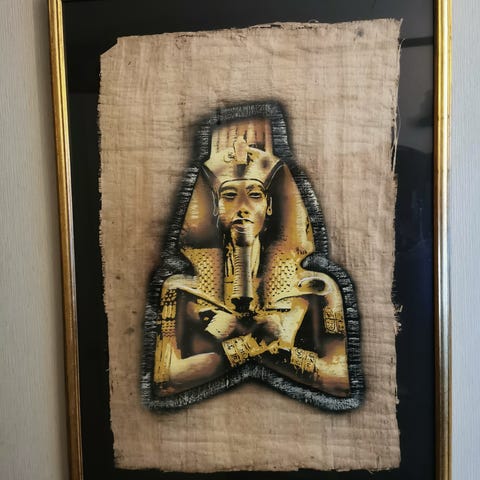 Bildet er profesjonelt innrammet med en matchende gullfarget ramme og sort passepartout som fremhever fargene i papyrusen.