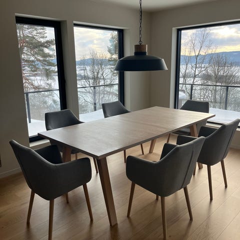 Solid spisebord med bordplate i 22mm heltre eik og ben av metall. Bordet er 110x200cm. Et lite merke på bordplaten, kan fint pusses og oljes på nytt om man ønsker det. Bordet kan også lett pusses ned og oljes i ønsket farge.