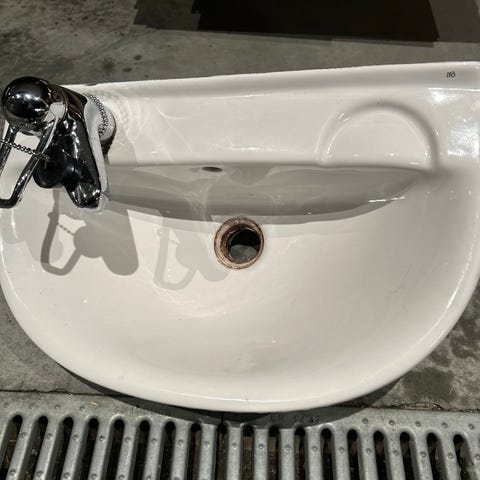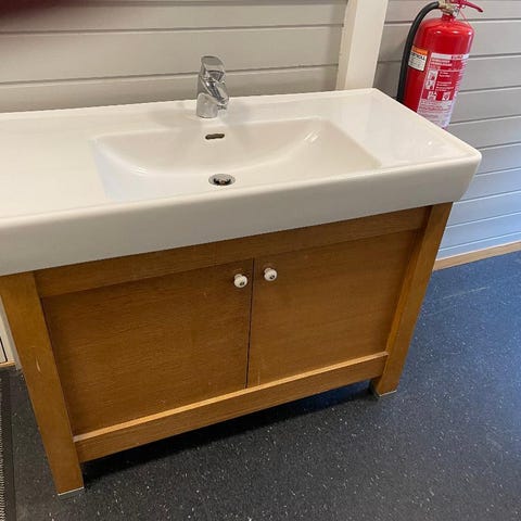 Servant. Oval nedfelt vask med avløp i midten og ett hull for armatur. Egnet for montering på baderomsinnredning eller som frittstående benkeplate med servant på bad.