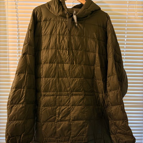 Kjøpt i januar 2026 og knapt brukt - Taion crewneck dunjakke for dame i størrelse S. Jakken er svart. Perfekt som lett ytterjakke i overgangssesonger eller som et ekstra lag under en tykkere kåpe eller jakke. Jakken kommer med en liten pose som den kan pakkes i. Jakken har høy splitt med knappelukking i sidene og lommer foran.
