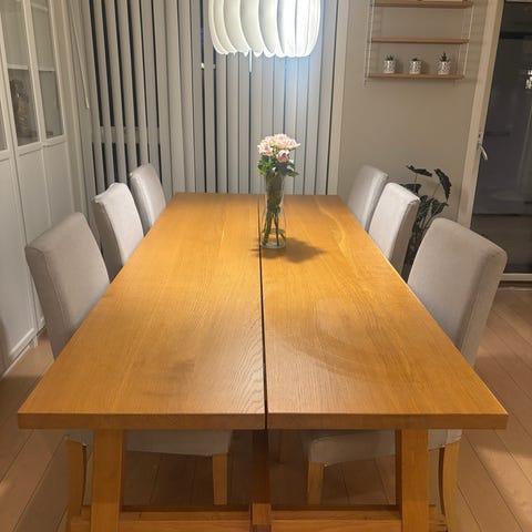 Godt brukt men i god stand. Liten skade på midten av bordplaten. Må hentes. Bein kan demonteres.