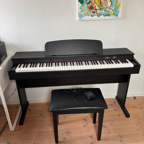 Følger med stativ, justerbar pianokrakk, notestativ, sustain pedal.