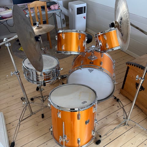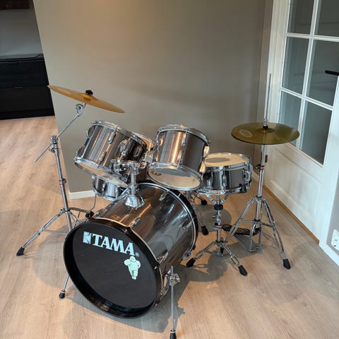 Meget pent i god stand. Sjelden farge, tror den heter Gunmetal sparkle. Endrer litt farge med lyset. 20 bass, 10, 12 og 14 tammer. Skarp 5x14 sensitone elite steel. Solid Tama hardwarepakke og bra symbaler fra Soultone. 20 ride, 15 crash og 14 hi-hat.
