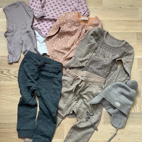 Den ene overdelen er i 86/92 men alt ble brukt når han var 1,5 år.