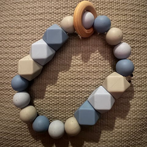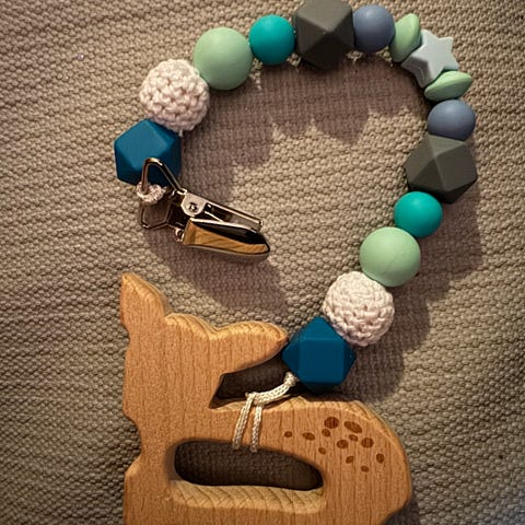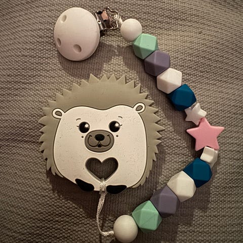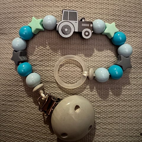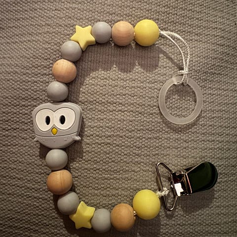 Smokkesnor med avtagbar silikonring til tutt/smokk, og feste. Aldri brukt.