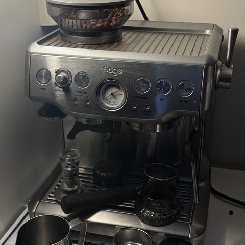 Selger Sage Barista espressomaskin, ca. 2 år gammel. Lite brukt, godt vedlikeholdt og fremstår som ny. Lager fantastisk kaffe og fungerer helt som den skal.