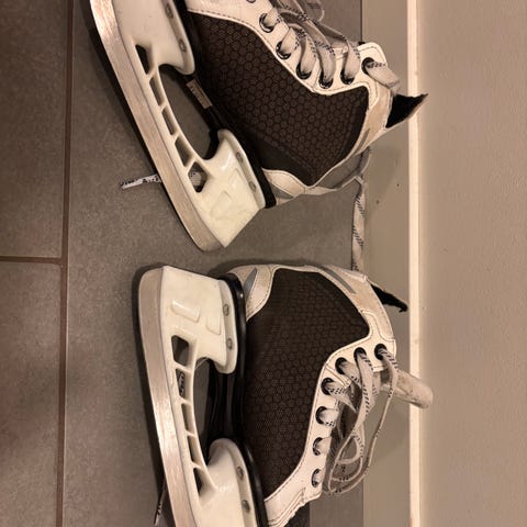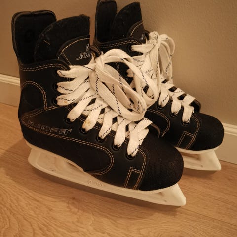 Ishockeyskøyter for barn i størrelse 33. Skøytene er svarte med hvite lisser og hvit såle. Egnet til ishockey og generell bruk på is for barn med skostørrelse 33.