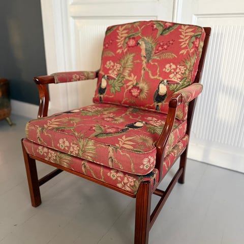 En nydelig, nett sofa & en karakteristisk lenestol - begge deler fra ca 1950. Møblene ble trukket på nytt med nydelig tekstil fra sannsynligvis Sanderson eller GP & J Baker innkjøpt enten hos Mortensen eller Tanum i Oslo i 1981/1982.