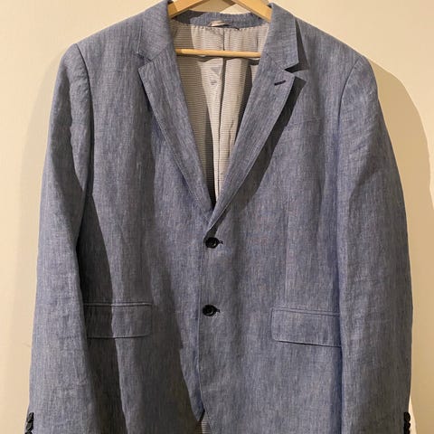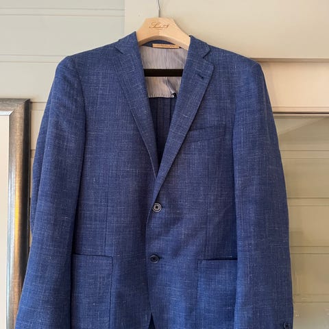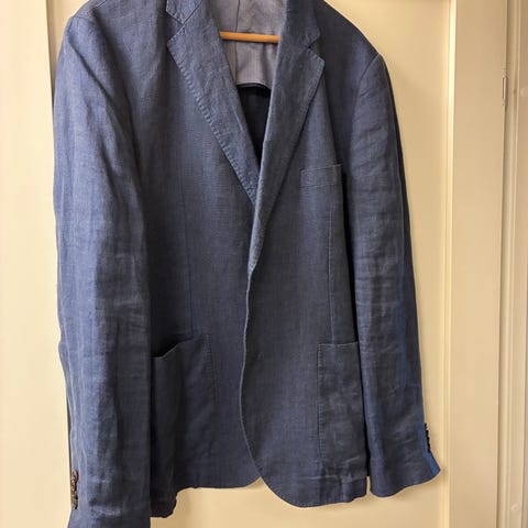 SAND Copenhagen Star Soft N herreblazer i størrelse 52. Blazeren er blå og laget i en linblanding med hovedvekt på lin. Modellen har klassisk jakkeslag, knappelukking foran og flere lommer, både utvendig og innvendig. Fôret har mønster og innvendige lommer med glidelås og kantbånd. Egnet som pen jakke til jobb, selskap eller andre anledninger der en lett og strukturert blazer i lin er ønsket. Har litt nupper, men det fjernes lett med nuppefjerner.
