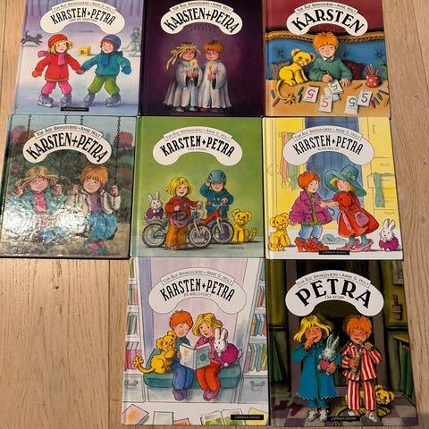 Karsten og Petra bildebøker for barn. Pakke med flere innbundne bøker i serien om Karsten og Petra. Bøkene har fargerike illustrasjoner og enkel tekst tilpasset høytlesning og tidlig lesetrening for barn. Egnet for barnehagealder og tidlig skolealder.