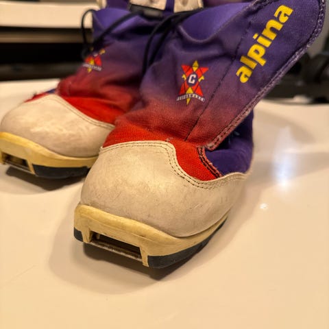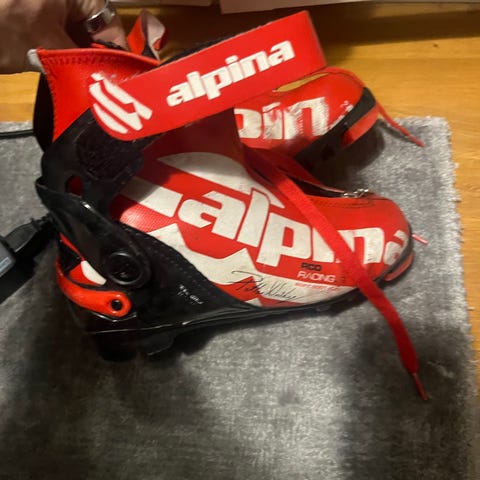 Alpina RCL 3.0 skistøvler i rødt med hvite og svarte detaljer. Modellen har høy ankelstøtte med ytre plastmansjett og borrelåslukking øverst. Fronten har glidelås som dekker snøringen for å beskytte mot snø og fukt. Støvlene er beregnet for langrenn og gir god støtte rundt ankel og hæl. Passer til bruk i preparerte løyper. En støttedel bak på høyre støvel er brukket, men kan lett limes. Støvelen kan dessuten fint brukes til tross for skaden.