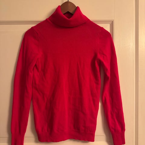 Fleischer Couture høyhalset genser i størrelse M. Genseren er rød og har ribbestrikket struktur. Materialet ifølge vaskelappen er 70 % ull og 30 % kasjmir. Høy hals og lange ermer. Er lite hull på baksiden av genseren. Se siste bilde.