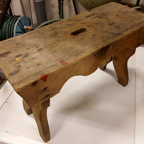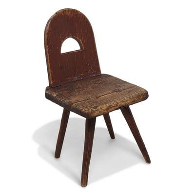 Gammel melkekrak med rundt sete og tre ben. 1800t.