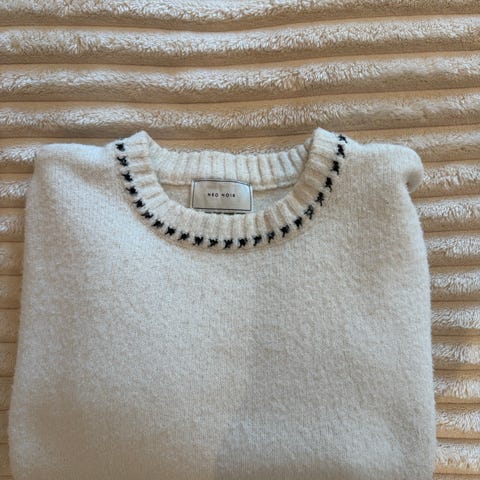 Neo Noir genser for dame i størrelse XS. Genseren er hvit med grønne horisontale striper og har rund hals. Den er ribbestrikket, med lange ermer og normal passform. Passer til hverdagsbruk og kan kombineres med både bukser og skjørt. Selger denne da den dessverre ikke passet meg.