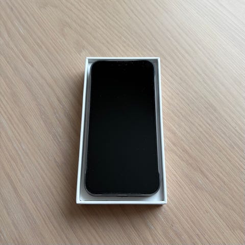 Apple iPhone 14 mobiltelefon med 128 GB lagringskapasitet. Modellen har svart front og bakside, med to hovedkameraer på baksiden. Skjermen dekker nesten hele fronten, med frontkamera og sensorer i øvre del.