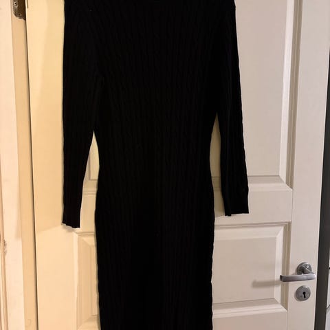 Gant strikket kjole for dame i størrelse M. Kjolen er svart og laget i bomull. Modellen har lange ermer, rund hals og ribbestrikket struktur, som gir en kroppsnær passform. Lengden går omtrent til kneet, avhengig av høyde. Egnet som enkel hverdagskjole eller til mer pyntede anledninger med riktig tilbehør.