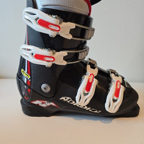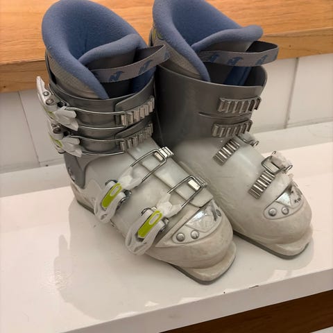 Nordica alpinstøvler/slalomstøvler til barn i hvit og grå farge. Støvlene har fire justerbare spenner og kraftig stropp øverst for bedre tilpasning rundt leggen. Myk, polstret innersko i lyseblått tekstil. Sålen er utformet for bruk i standard alpinbindinger.