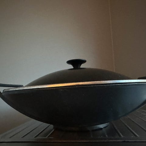 Le Creuset wokpanne i støpejern med rød emaljert utside. 14cm flate.
