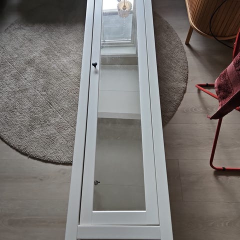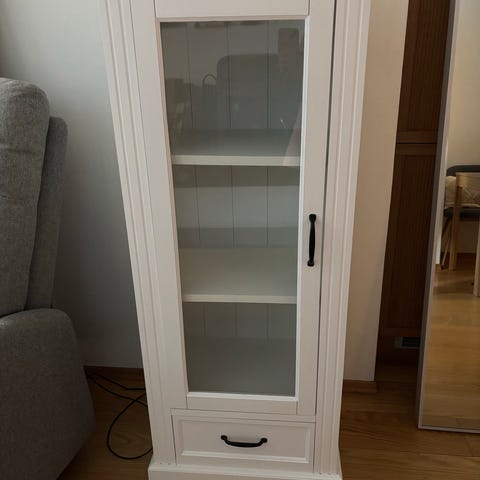 Gis bort pent brukt vitrineskap med glasshyller og to skuffer.