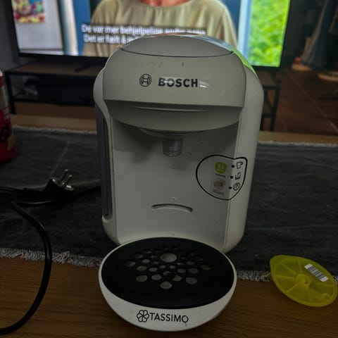 Bosch Tassimo kapselkaffemaskin i hvit, med kaffekapsler selges da den ikke er i bruk.