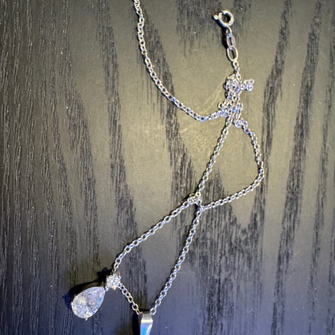 smykke i sølv for dame med anheng dekorert med krystaller. Smykket har en tynn sølvkjede med fjærlås og et dobbelt anheng med dråpeformede elementer besatt med små klare krystaller. Passer som hverdags- eller tilbehør til penere antrekk.