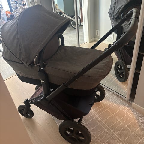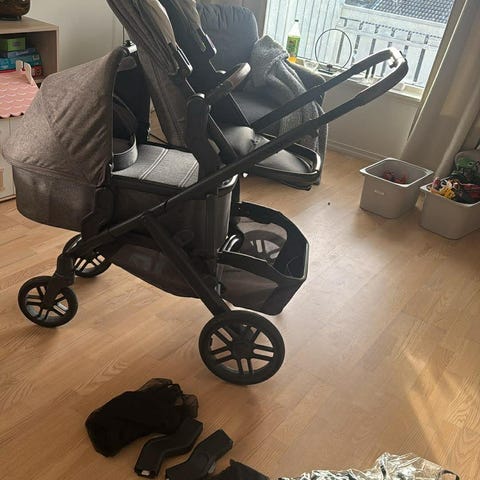 Vognen kan brukes både med liggedel for nyfødt og sittedeler for større barn, og er tilpasset transport av to barn samtidig. Vognen kommer med regntrekk til alle vogndelene og to forskjellige solskjerminger. Den ene har hull(se bilde). Vognen er i god stand, men har naturlige bruksmerker. Må hentes, kan bistå med levering i Kristiansand