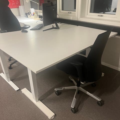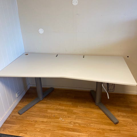 Skrivebord med hvit, rektangulær bordplate og hvite metallben. Bordet har en enkel og funksjonell utforming som passer godt som arbeidsbord eller skrivebord i hjemmekontor, stue eller soverom. Overflaten er glatt og lett å tørke av, og understell med to ben gir god benplass under bordet. Egnet for bruk med kontorstol og datamaskin, og gir plass til skjerm, tastatur og annet kontorutstyr.