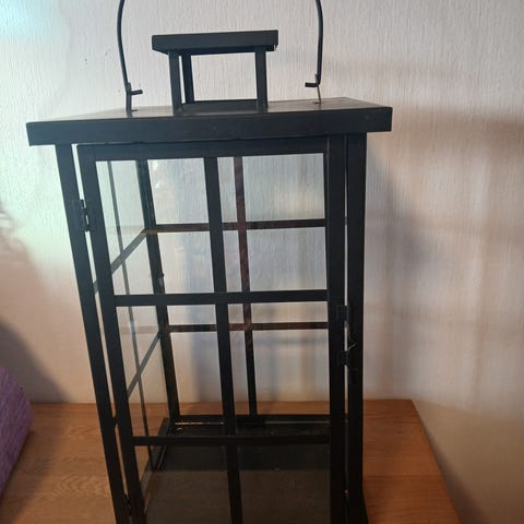 Lanterne i metall og glass med bærehåndtak i skinn. Rektangulær form med glass på alle sider og dør i front for plassering av lys. Egnet for bruk med kubbelys eller telys. Kan brukes både inne og under tak utendørs etter behov.