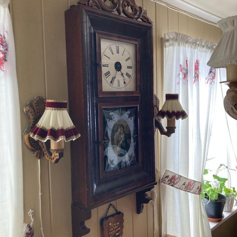 Waterbury Clock Company veggur i tre med rektangulær kasse. Uret har hvit urskive med romertall og dekorative detaljer i hjørnene. Nederste del av fronten har glassfelt med malt dekor. Mekanismen er synlig bak en innvendig papiretikett med produsentinformasjon. Vinduet foran kan åpnes for tilgang til urverk og pendel. Passer som veggur i stue, gang eller andre oppholdsrom der man ønsker et mekanisk klokkeur i tre.