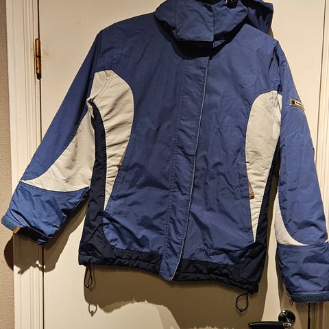 Fin mørk blå jakke, noen av bildene viser for grå farge, men den er mørke blå.