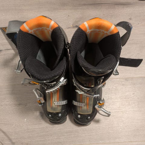 Head skistøvler for barn i størrelse 210–225 mm. Modellen har to spenner i metall med justering for bedre passform. Ytterskall i svart plast med grå og gule detaljer, samt grå innerstøvel. Baksiden er merket med «Easy Entry» for enklere inn- og utsteg. Passer til vanlige alpinski-bindinger som er kompatible med denne skostørrelsen. 26 cm lang sko.
