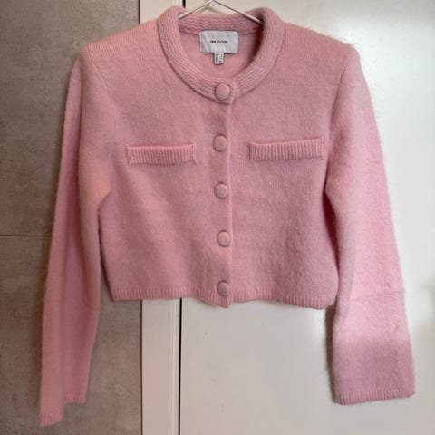 Ane Mone cardigan for dame i størrelse L. Cardiganen er rosa og strikket i angoraullblanding (70 % angora og 30 % nylon). Modellen har rund hals, lange ermer og lukkes med dekorative knapper i front. To frontlommer. Passer som lett og myk overdel til hverdagsbruk eller over kjoler og topper.Ny pris 1999