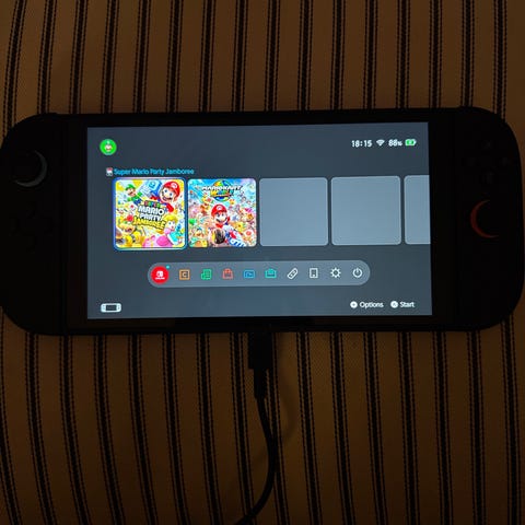 Nintendo Switch 2 spillkonsoll med tilbehør. Bildene viser håndholdt konsoll med innebygde kontroller, dokkingstasjon for tilkobling til TV, Joy-Con-grep og bæreetui. Konsollen kan brukes både som håndholdt enhet og koblet til TV via dokkingstasjonen. Strømadapter og kabler følger med slik det fremgår av bildene. Egnet for ulike typer spill og flerspillerbruk lokalt eller online, avhengig av spill og abonnement.