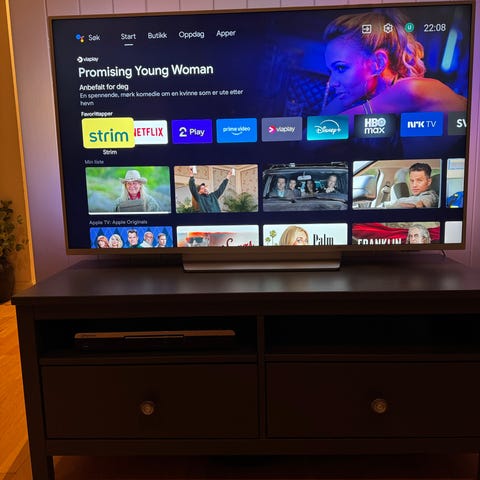 Samsung QLED TV med 65 tommers skjerm i svart utførelse. Den er brukt med et par sprekker i rammen, men dette påvirker ikke seeropplevelsen.