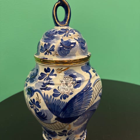 Porselenskrukke med lokk hvit og blå