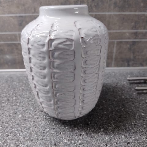 Vase i keramikk med dekorative elementer i trestruktur.