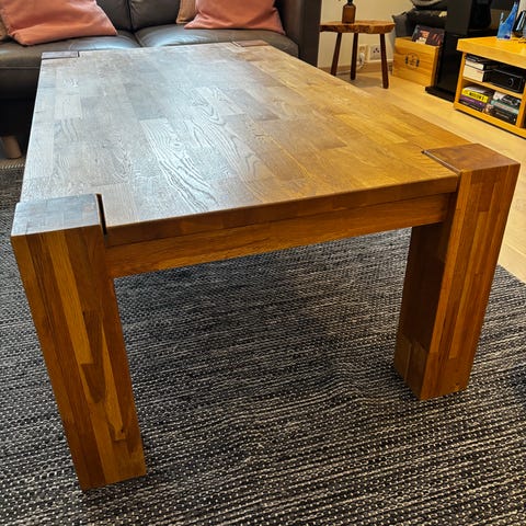 Selger et meget pent firkantet hjørne-/sofabord i heltre oljet eik. Som nytt.