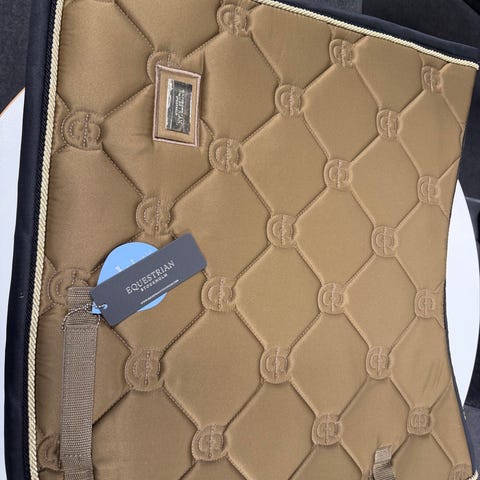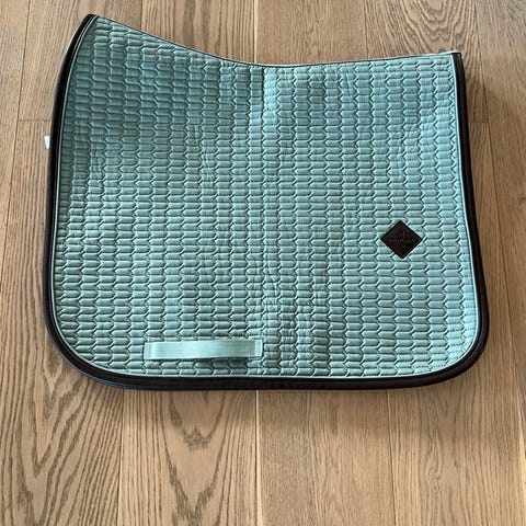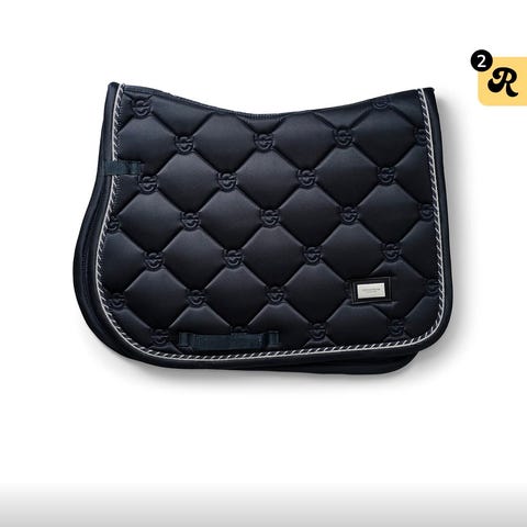 Elegant schabrack i en kald, dyp teal farge med sølvdetaljer. Dekorert med Equestrian Stockholm badge i svart.