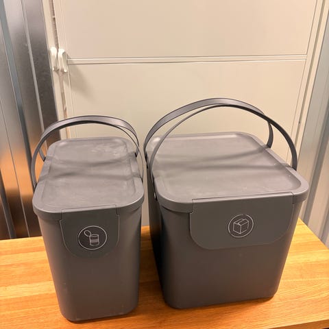 Settet består av flere grå avfallsbøtter med lokk i ulike farger (gul, blå, grønn) med symboler for sortering. Bøttene er laget i plast og er formet slik at de kan stå tett inntil hverandre, for eksempel i et skap, bod eller vaskerom.
