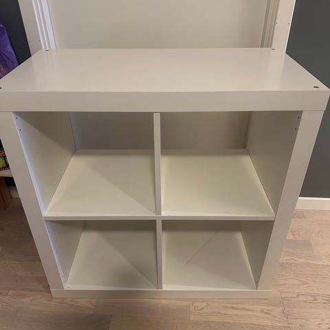 Selger en pent brukt IKEA Kallax hylle i hvit (77x147 cm).