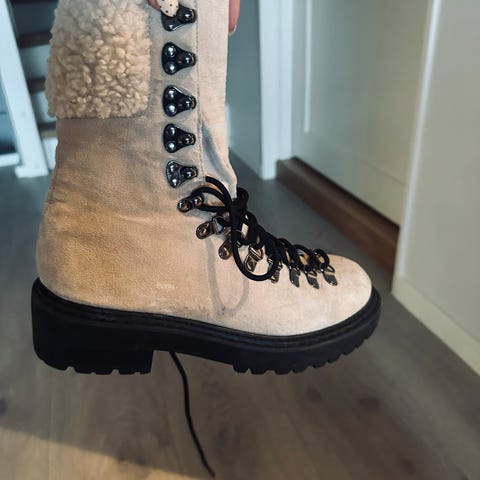 Skoene har blitt brukt 2–3 ganger, men ser at stoffet har begynt å gå litt opp i sømmen. Utover dette er de i god stand. De er litt store i størrelsen, så de passer til en litt større fot (min fot er 25 cm).