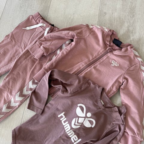 Hummel joggedress for jente i størrelse 92. Sett med genser og bukse i rosa farge. Genser med lange ermer og Hummel-logo på brystet. Pent brukt.