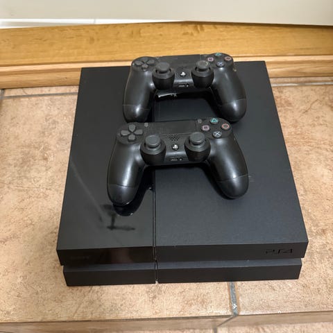 Sony Playstation 4 spillkonsoll med to trådløse DualShock 4 kontrollere i svart. Konsollen støtter HD‑grafikk, Blu‑ray‑plater og digital nedlasting av spill. DualShock 4‑kontrollerne har innebygd berøringsflate, bevegelsessensor og hodetelefonutgang. Egnet for bruk med TV eller skjerm med HDMI‑tilkobling og gir tilgang til et bredt utvalg av PS4‑spill og underholdningsapper, avhengig av brukerens egne abonnementer og kjøp.
